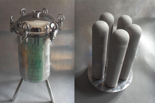 一、鈦棒過濾器產品介紹: 鈦棒過濾器使用的是鈦粉末燒結濾芯,一般用于粗濾和中間過濾。此濾芯具有精度高,耐高溫,耐腐蝕,機械強度高等優點,在醫藥行業廣泛應用,外殼材料為316L或304不銹鋼。符合GMP標準。 二、鈦棒過濾器用途: 本過濾器采用不銹鋼材料做外殼,內部濾芯為鈦管,具有耐高溫、高壓、強酸、強堿、耐腐蝕,濾芯可反復再生使用等特點,是采用粉末冶金方法將金屬粉末通過高溫燒結的方法加工制成的空心濾管。此系列產品具有結構緊湊造型美觀按GMP標準生產,管件連接采用國際標準快裝式連接,拆裝清洗方便。 三、鈦棒過濾器使用注意事項: 1、避免劃傷碰撞,灰塵及油污。 2、在使用中其工作壓力不應超過額定工作壓力。 3、本產品工作運行到一定周期后,可能由于過濾元件堵塞,至使壓力升高流量降低,需要反沖或反洗再生。再生周期視額定的壓力和流量而定。 四、鈦棒過濾器清洗方法: 鈦棒濾芯在使用一段時間以后,將產生一定程度的堵塞,表現流量減少,過濾前端壓力增高,如:從0.22pa以下升高到0.3mpa以上,這時就要對濾芯進行清洗,清洗方法一般有以下幾種: 1、對于新使用的濾芯,一般采用清水反洗,氣體反吹的方法來進行清洗,即用稍大于工作壓力(如0.3mpa)的清水反方向注水清洗。反沖時間約為1-3分鐘即可。 2、對于多次反沖洗后過濾效果不明顯回升的時候,可用5%以下的鹽酸溶液,或8%以下的硫酸溶液,或10%以下的NaoH溶液在常溫下浸泡,再用清水洗凈。 具體選用酸洗或堿洗,應視過濾液中雜質容易溶于酸或緘來選擇。